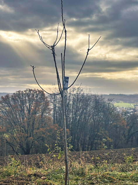 Der neu gepflanzte Apfelbaum im Rahmen der Baum-Pflanz-Challenge