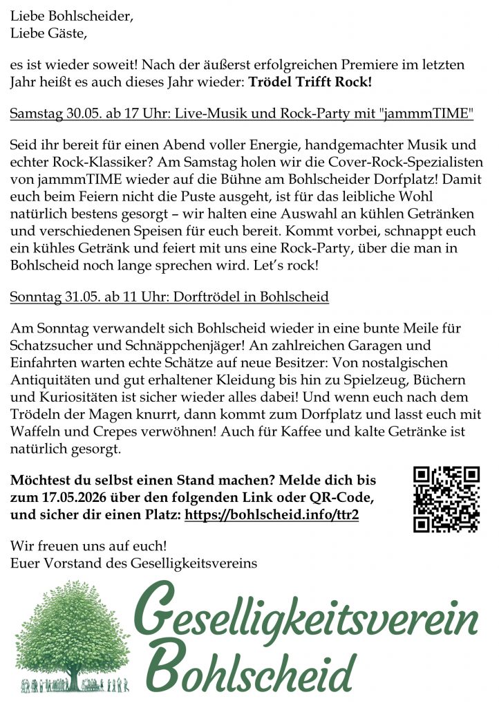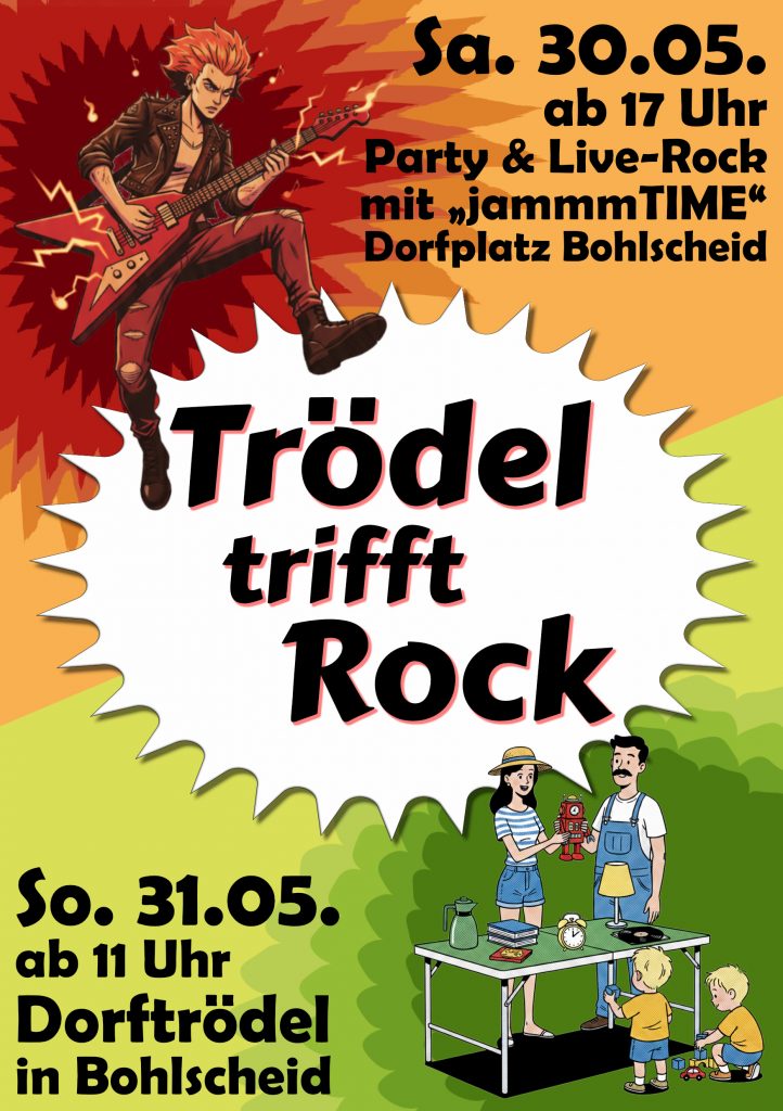 Es ist wieder soweit! Nach der äußerst erfolgreichen Premiere im letzten Jahr heißt es auch dieses Jahr wieder: Trödel Trifft Rock! Am Samstag, den 30.05.2026 dürfen wir erneut die Band jammmTIME auf unserem Dorfplatz begrüßen und feiern eine große Rock-Party. Am Sonntag, den 31.05.2026 steht dann der große Dorftrödel in Bohlscheid an. Du willst beim Dorftrödel mit einem eigenen Stand dabei sein? Dann trage dich unten auf der Seite direkt ein!